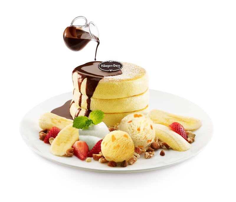 新口味哈蜜瓜及芒果冰淇淋搭配現烤舒芙蕾鬆餅,淋上濃純巧克力醬佐香甜草莓、香蕉及堅果仁。