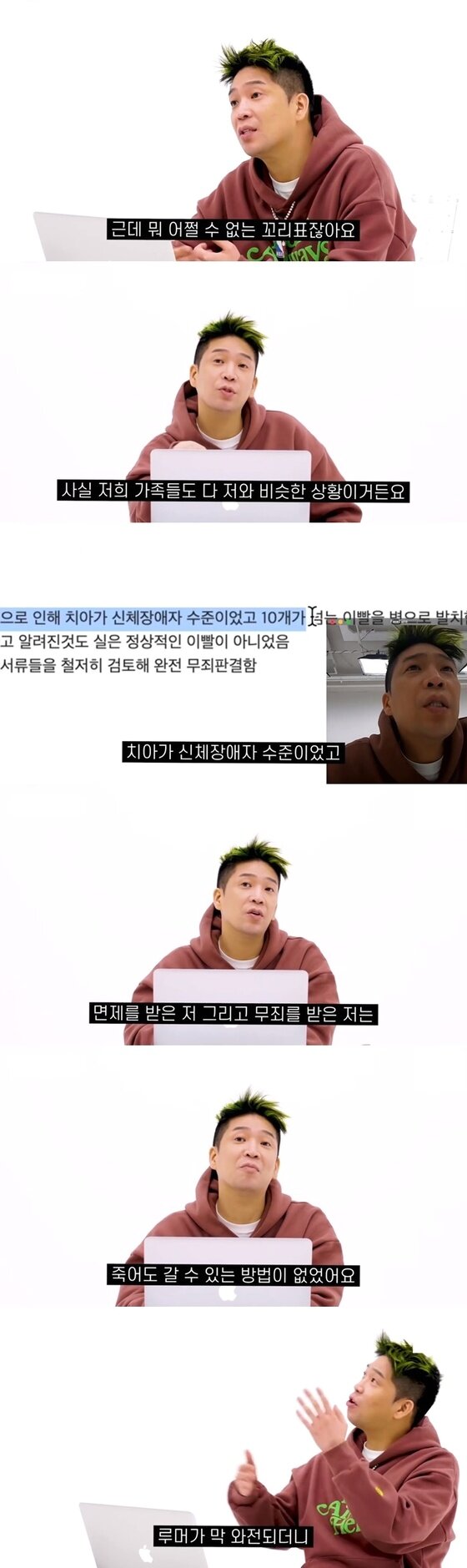 MC몽은 해당 영상에서 병역기피 논란과 루머에 대한 해명도 이어갔다. 그는 병역을 기피하려는 목적으로 발치했다는 의혹과 재판 결과 무죄로 판결났다는 글을 읽으며 "아무리 말해도 사람들이 믿지 않는다"며 "우리 가족들도 나와 치아 상태가 비슷한 상황이지만, 이렇게 말하는 것이 구질구질해서 말 안하고 싶다"고 밝혔다.