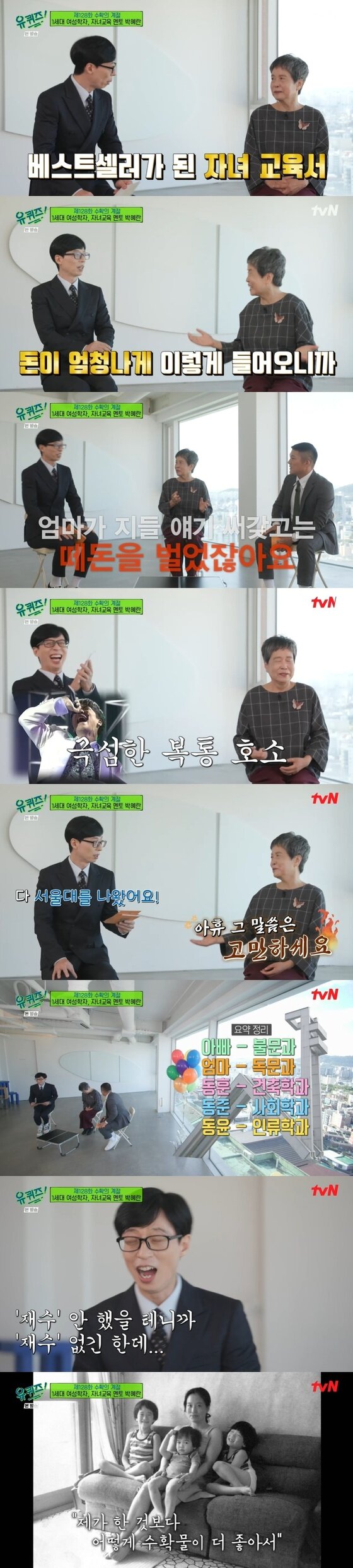 책을 쓰려 할 때 이적을 비롯한 아이들은 반대했었다고. 박혜란 작가는 "어머니가 언제 저희를 키웠냐, 알아서 자랐지, 키운 게 아니다 하더라"라고 솔직히 전해 폭소를 유발했다.