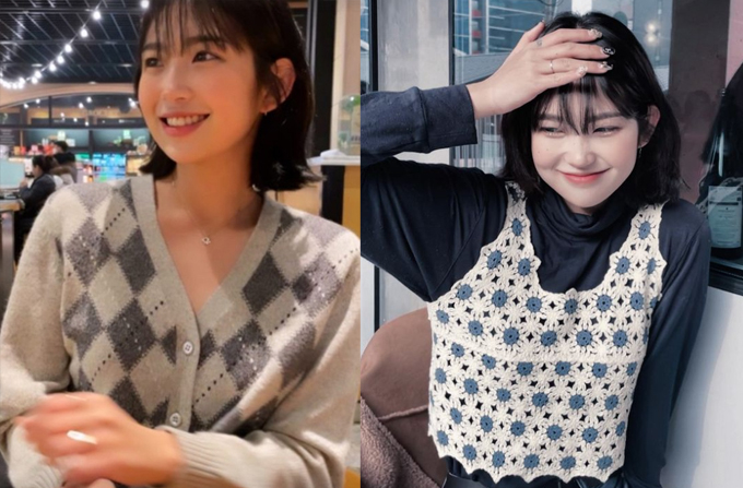 사진 속 최준희는 시스루 앞머리를 내린 단발머리에 아가일 패턴 카디건을 입고 어딘가를 응시하며 환하게 미소 짓는 모습이다.